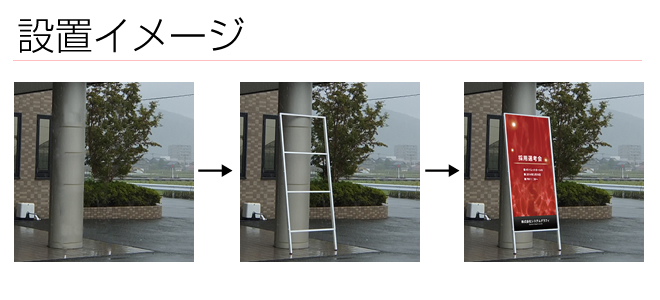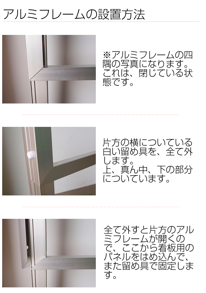 アルミフレームの立て看板になります。従来の木製立て看板とは違い、アルミフレームなので中のボードを変えれば繰り返し使用できます。